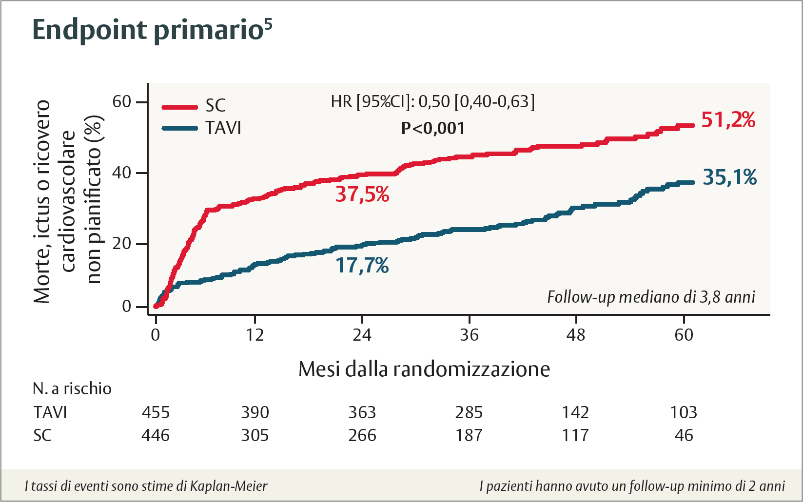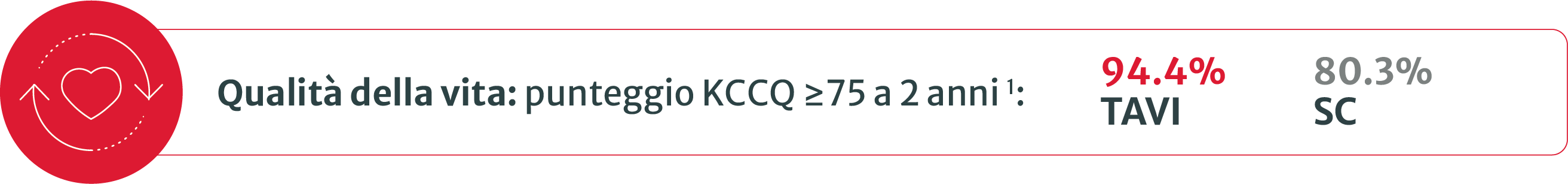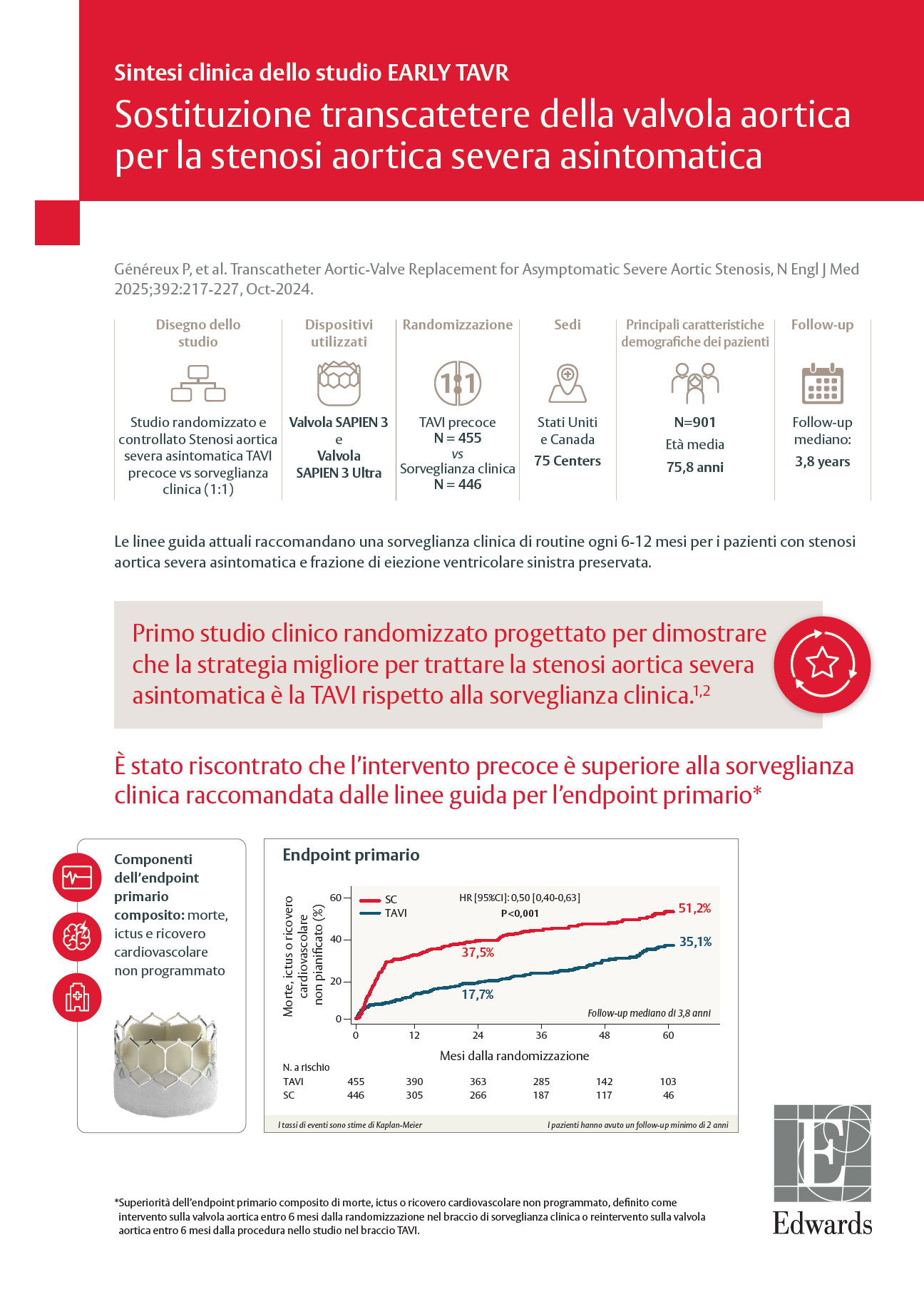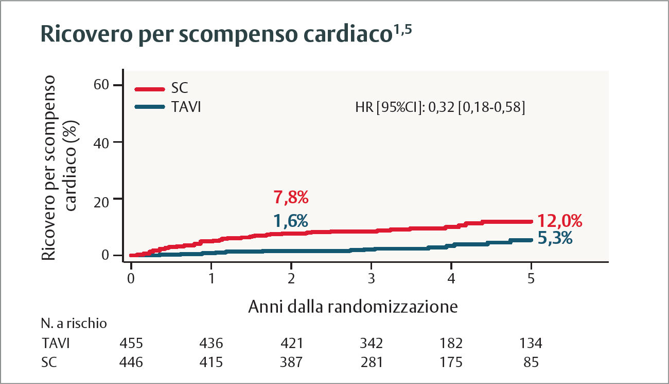 *Superiorità dell’endpoint composito primario di morte, ictus o ricovero cardiovascolare non pianificato, definito come intervento sulla valvola aortica (AV) entro 6 mesi dalla randomizzazione nel braccio di sorveglianza clinica (SC) o come reintervento AV entro 6 mesi dalla procedura nello studio nel braccio TAVI.