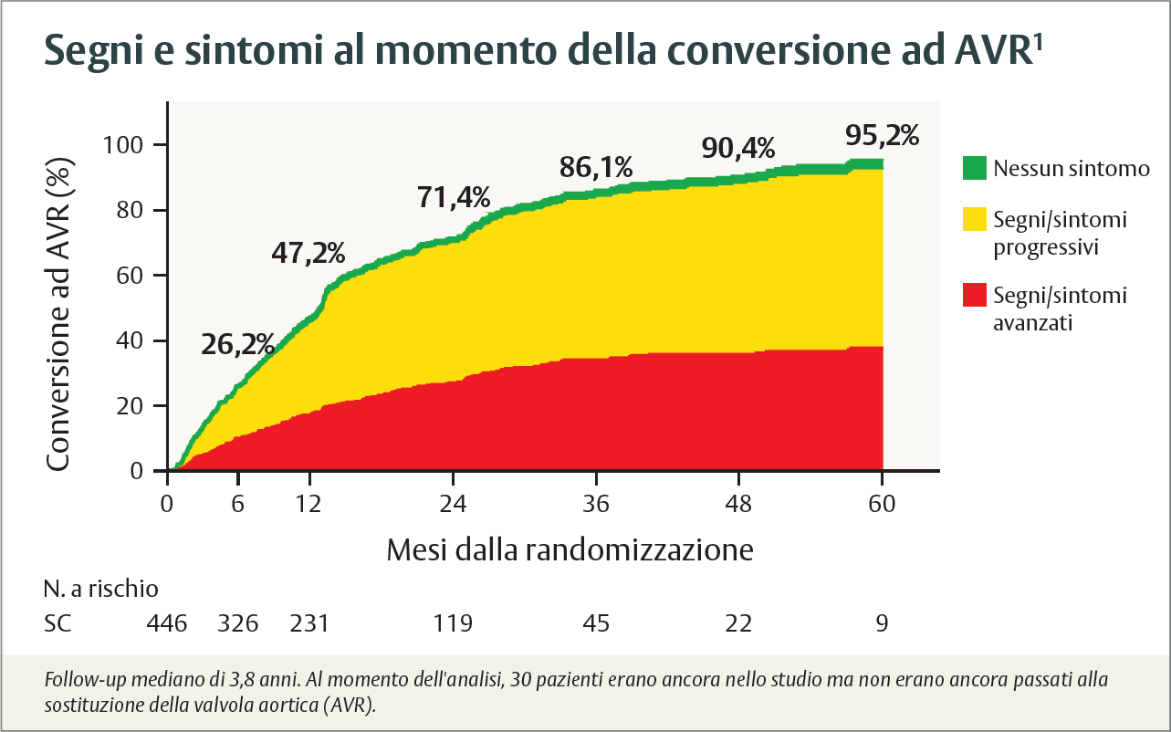 Nel trial EARLY TAVR, 1 paziente su 4 nel gruppo di sorveglianza ha infine necessitato di una sostituzione della valvola aortica entro 6 mesi, spesso presentandosi con sintomi avanzati. Questo evidenzia la natura imprevedibile della progressione della malattia e il potenziale deterioramento prima dell’intervento.1,5