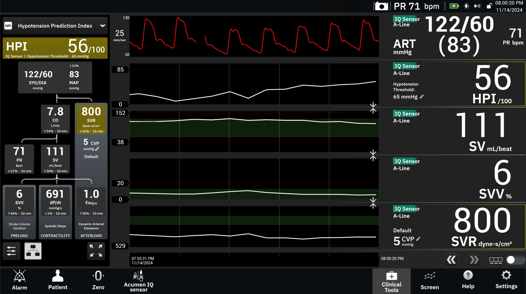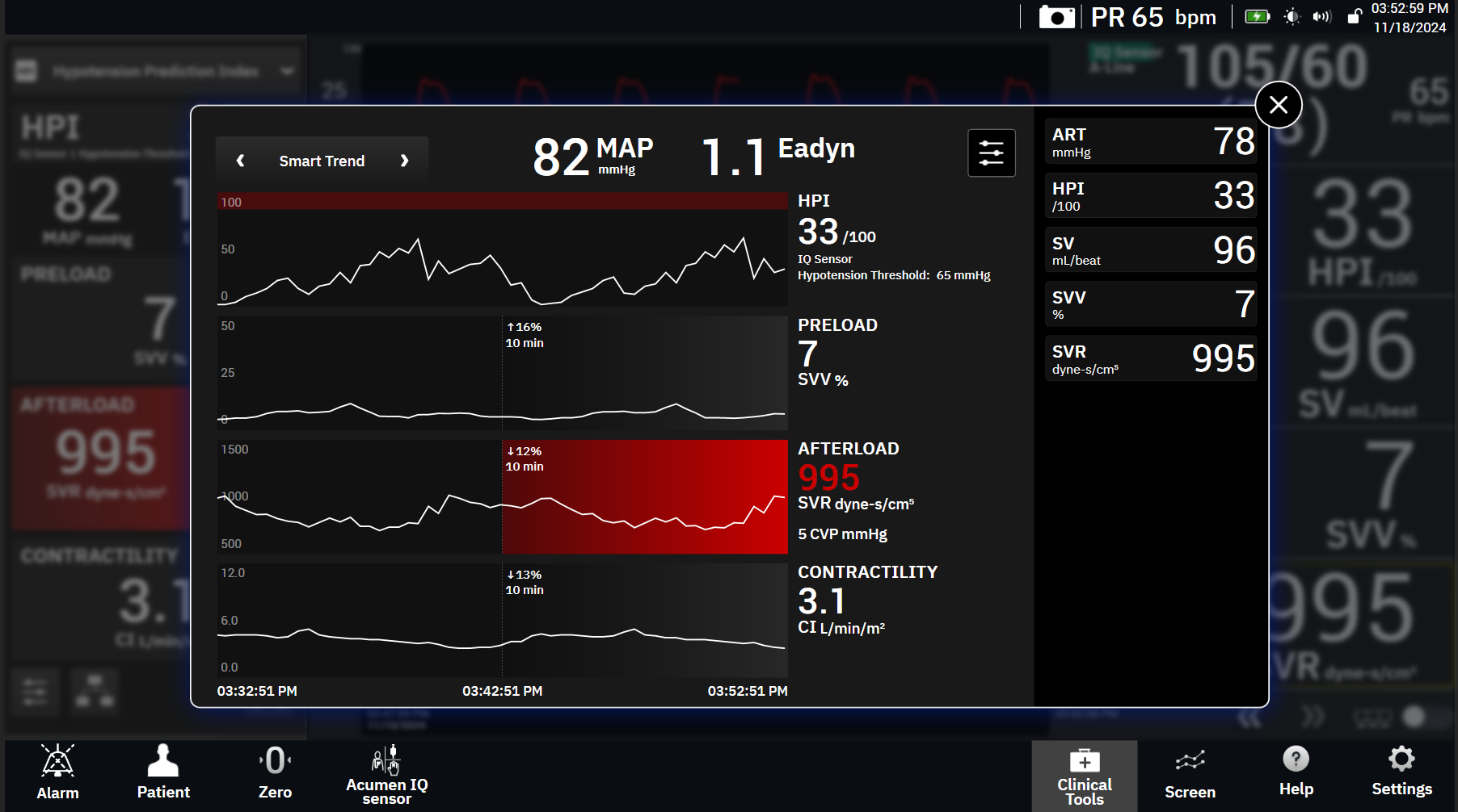 When hemodynamic instability is detected, HPI™ Smart Alerts and Trends provide you with a focused view of the potential targets for intervention, such as preload, afterload and contractility.