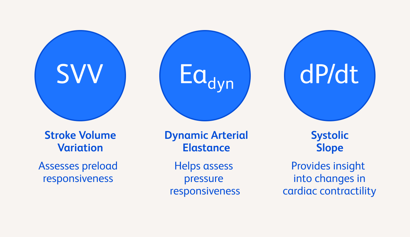 Blood pressure alone does not reflect perfusion. Acumen HPI™ Software provides continuous insights into hemodynamic trends that can help clinicians detect instability and identify the potential root cause. Additional advanced parameters, dP/dt and Eadyn, provide deeper insights into the underlying cause of hemodynamic instability, supporting targeted interventions.